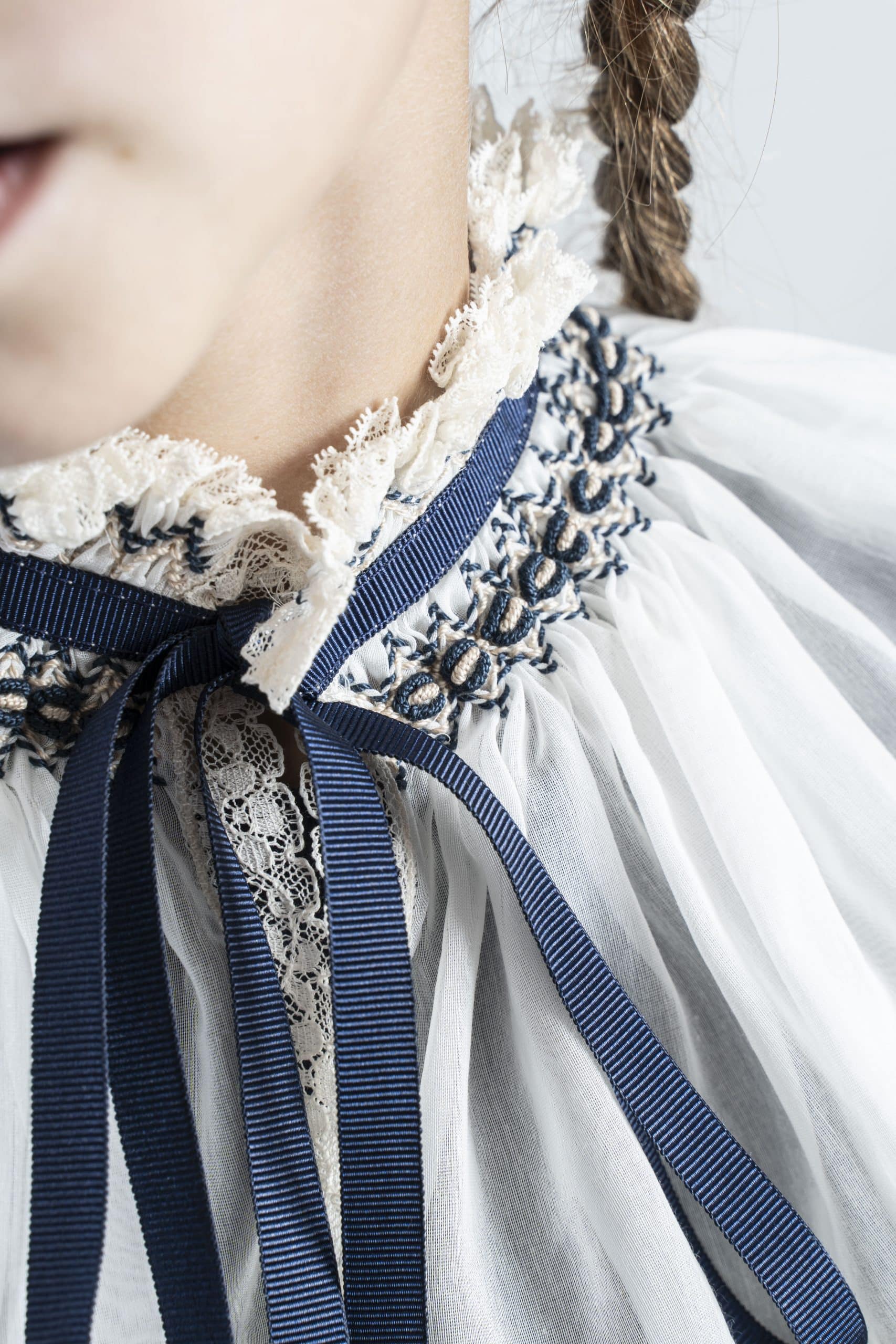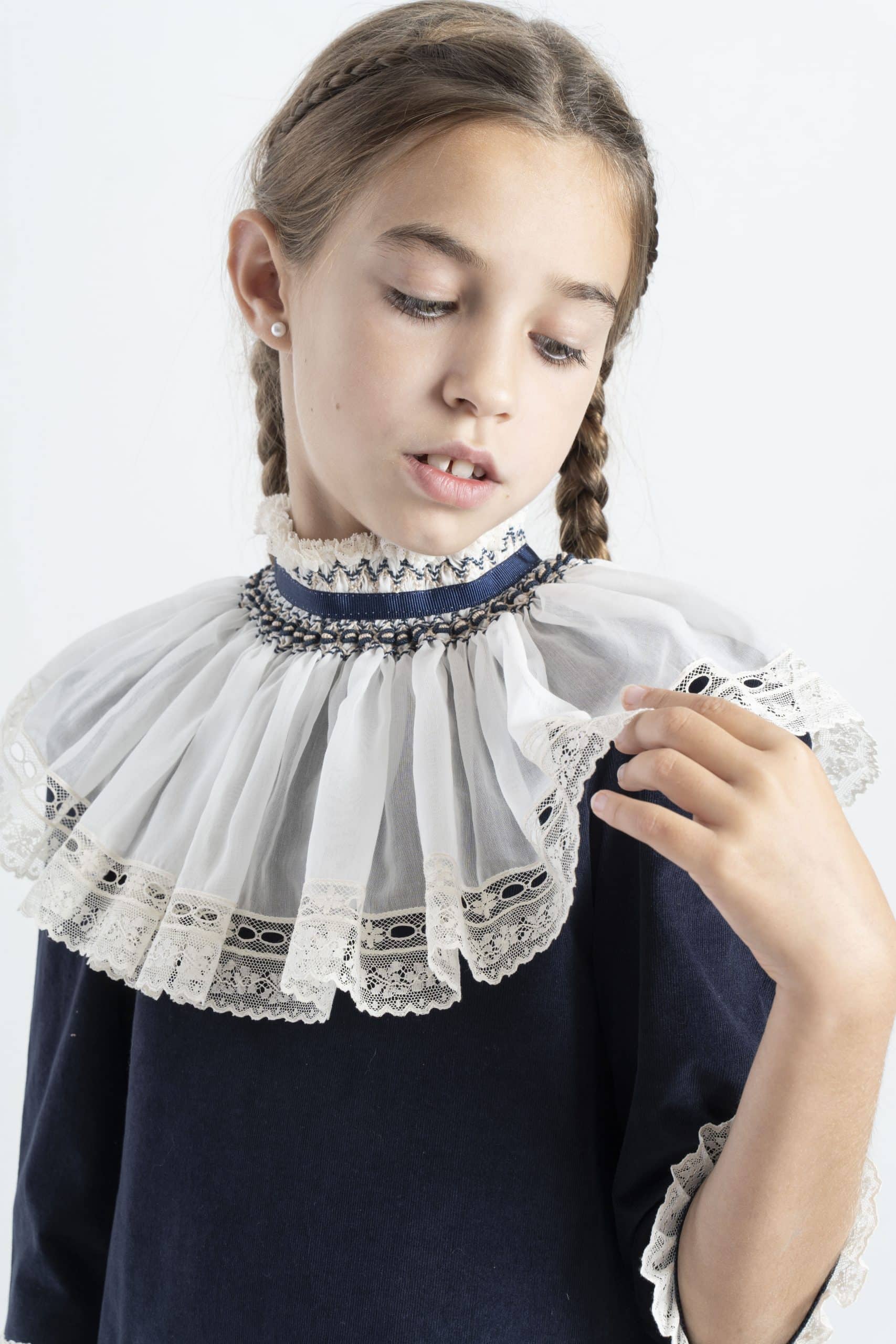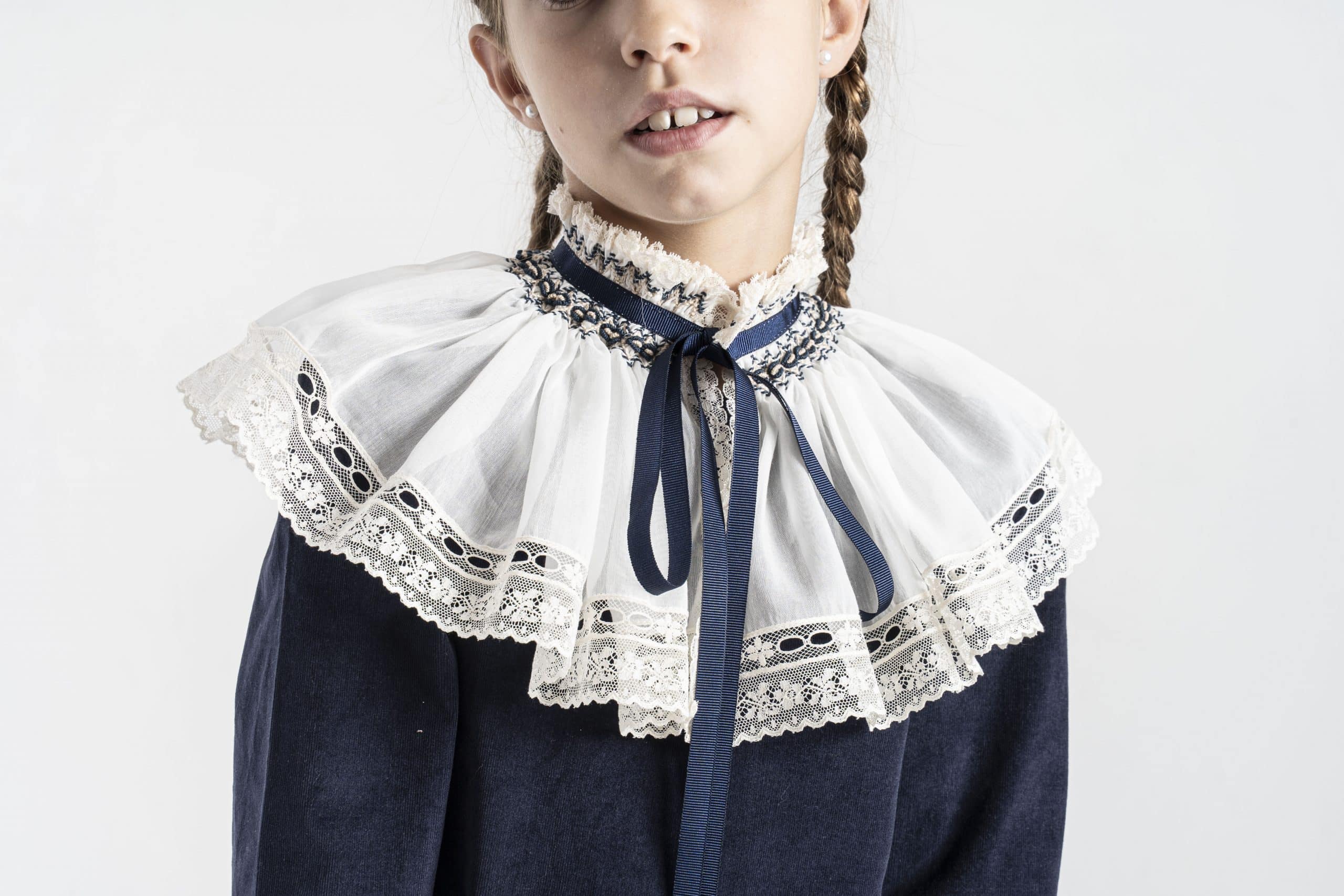 Cuello de nido de abeja bordado totalmente a mano en seda-algodón y rematado con delicada puntilla de valencienne francés. Se fijan a los vestidos o camisas con unas presillas. Se fijan a los vestidos o camisas con unas presillas.