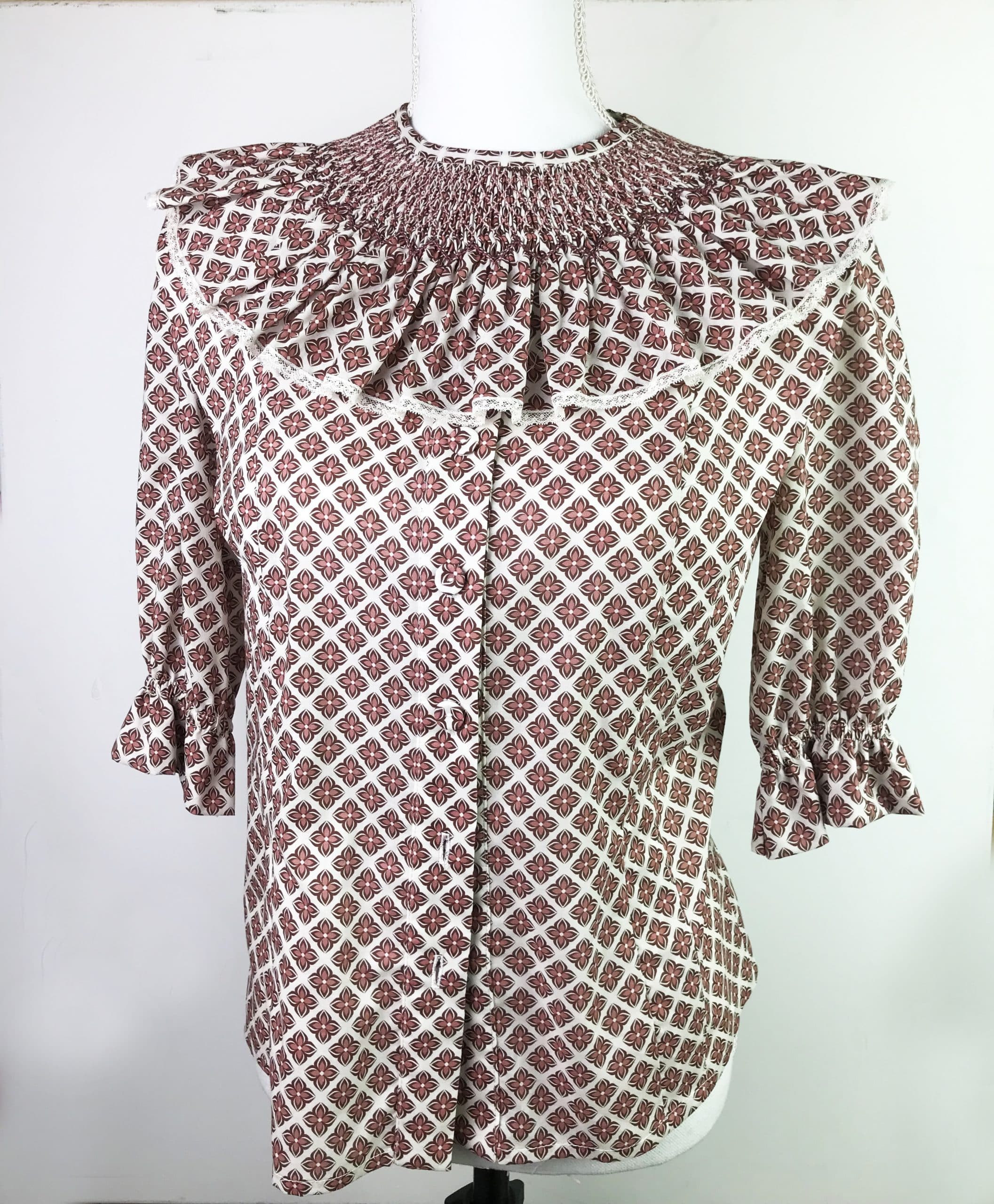 El cuello María es un cuello bordado totalmente a mano en punto smock o nido de abeja. Se fija a las camisas de la colección con unas presillas que no se ven.