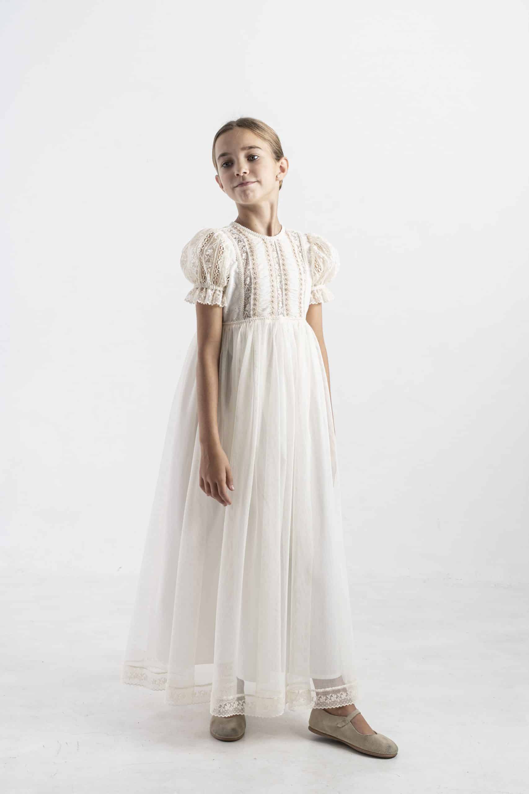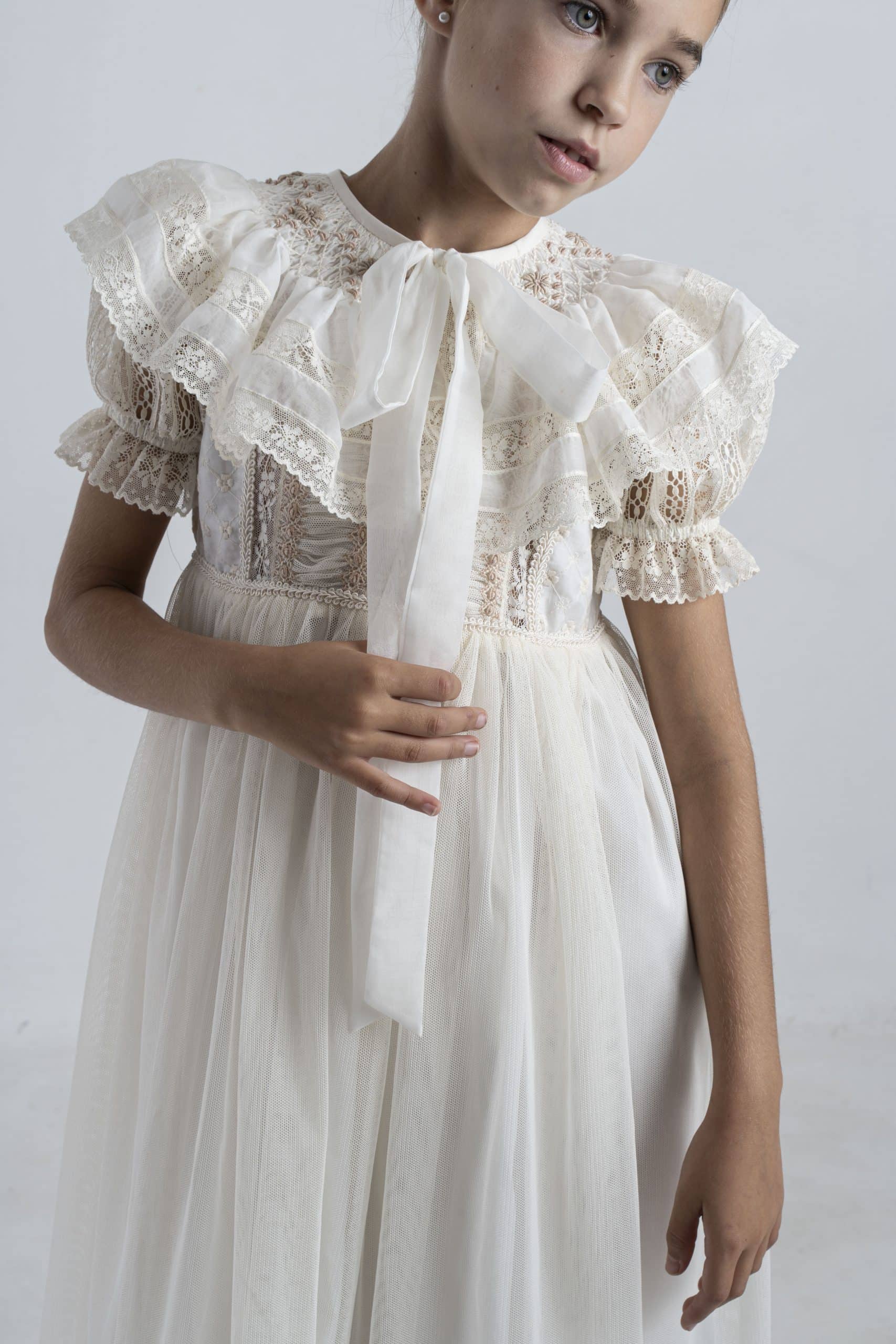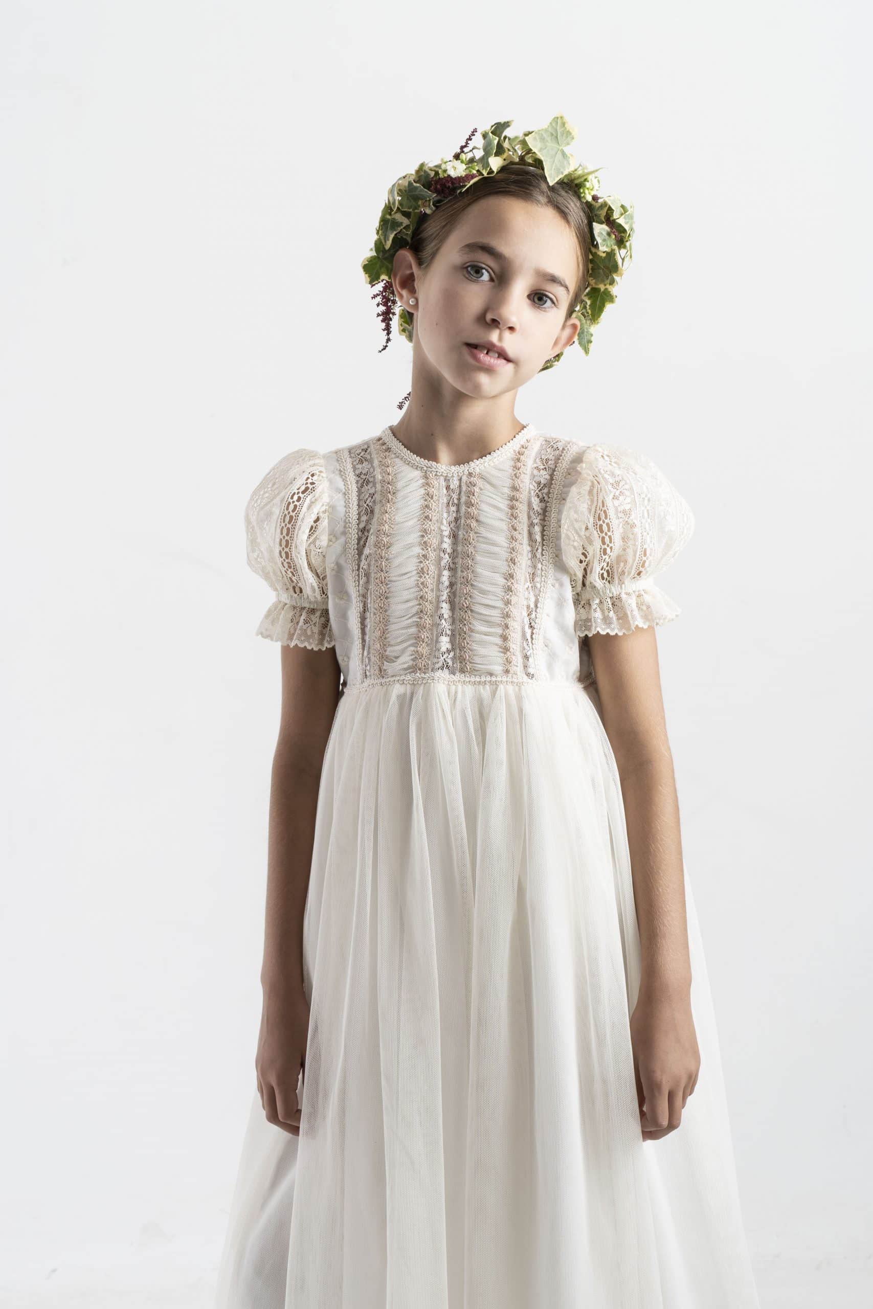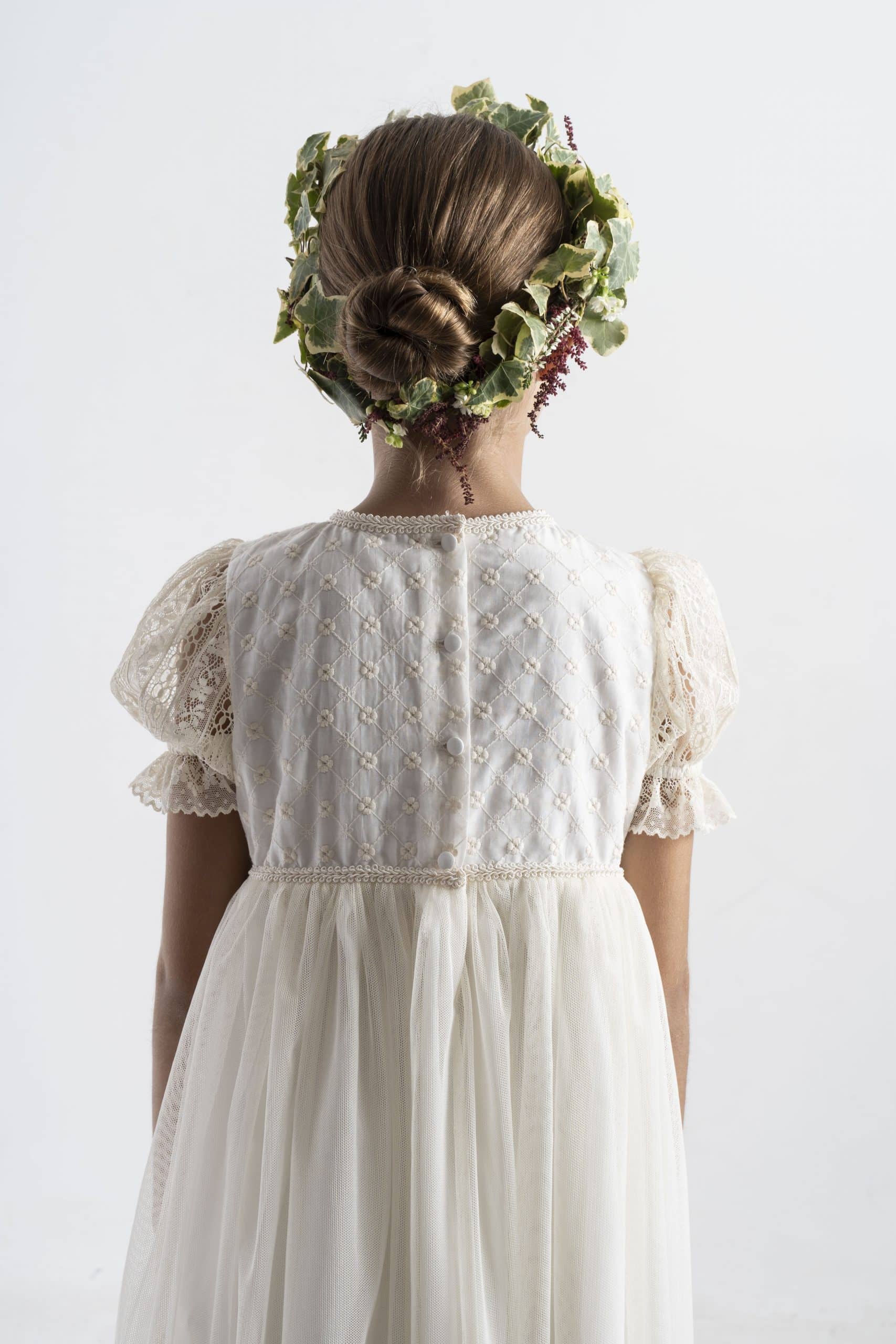 Vestido hecho en tul de algodón con bordado en nido de abeja hecho a mano. El vestido tiene delicados encajes de Valencienne francés. El plazo de entrega son 6 semanas. El vestido se hace a medida de modo que en los comentarios nos tenéis que especificar la fecha del evento, la talla de la niña, la edad, la altura, y las medidas, y si queda mucho para el evento os llamaremos para confirmar todos estos datos cuando se acerque el día  del evento y vayamos a empezar a confeccionar. Aquellas que lo deseéis, podéis venir a ver los vestidos en vivo pidiendo cita y a que tomemos medida a la niña. En la última foto se explica como tomar las medidas.