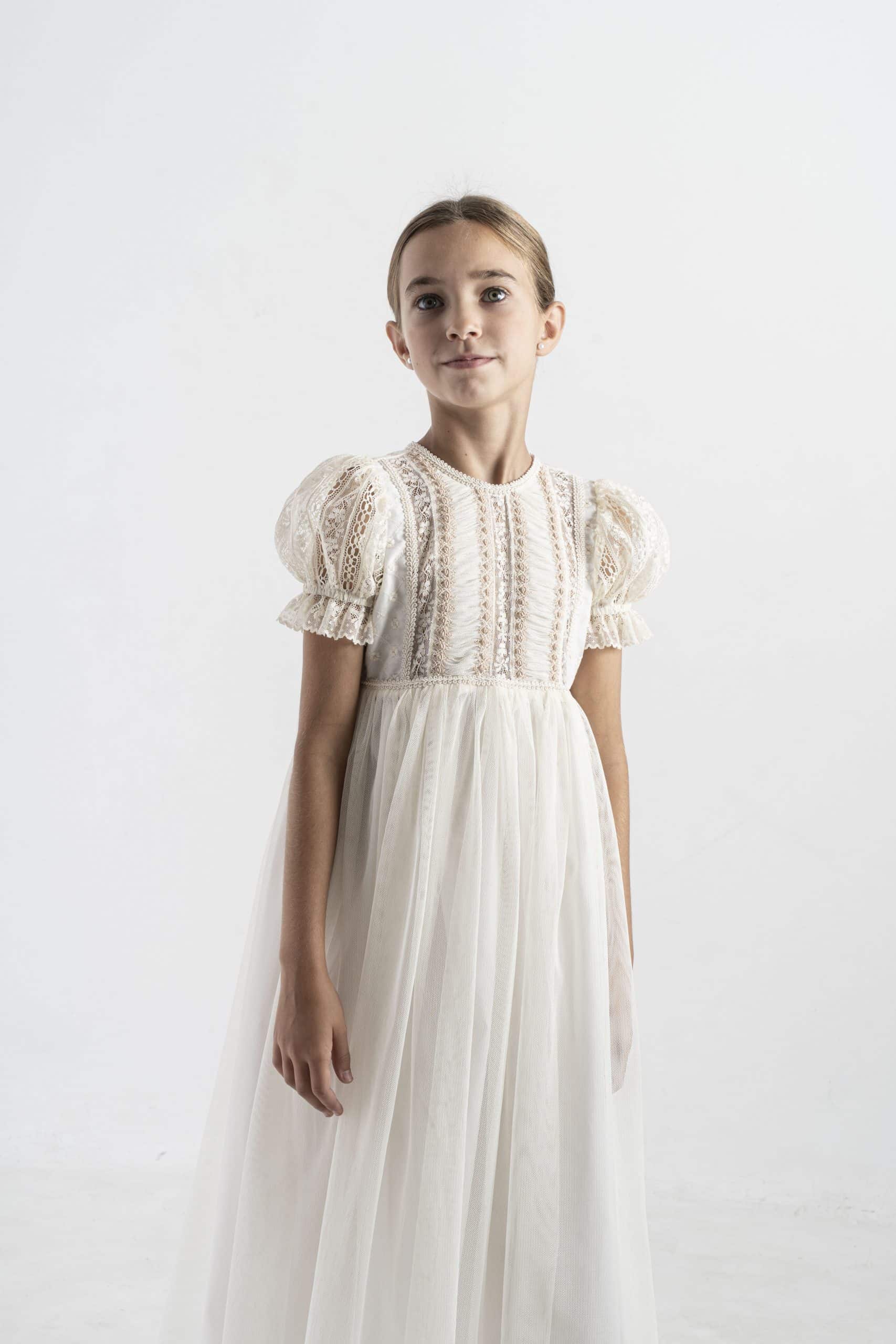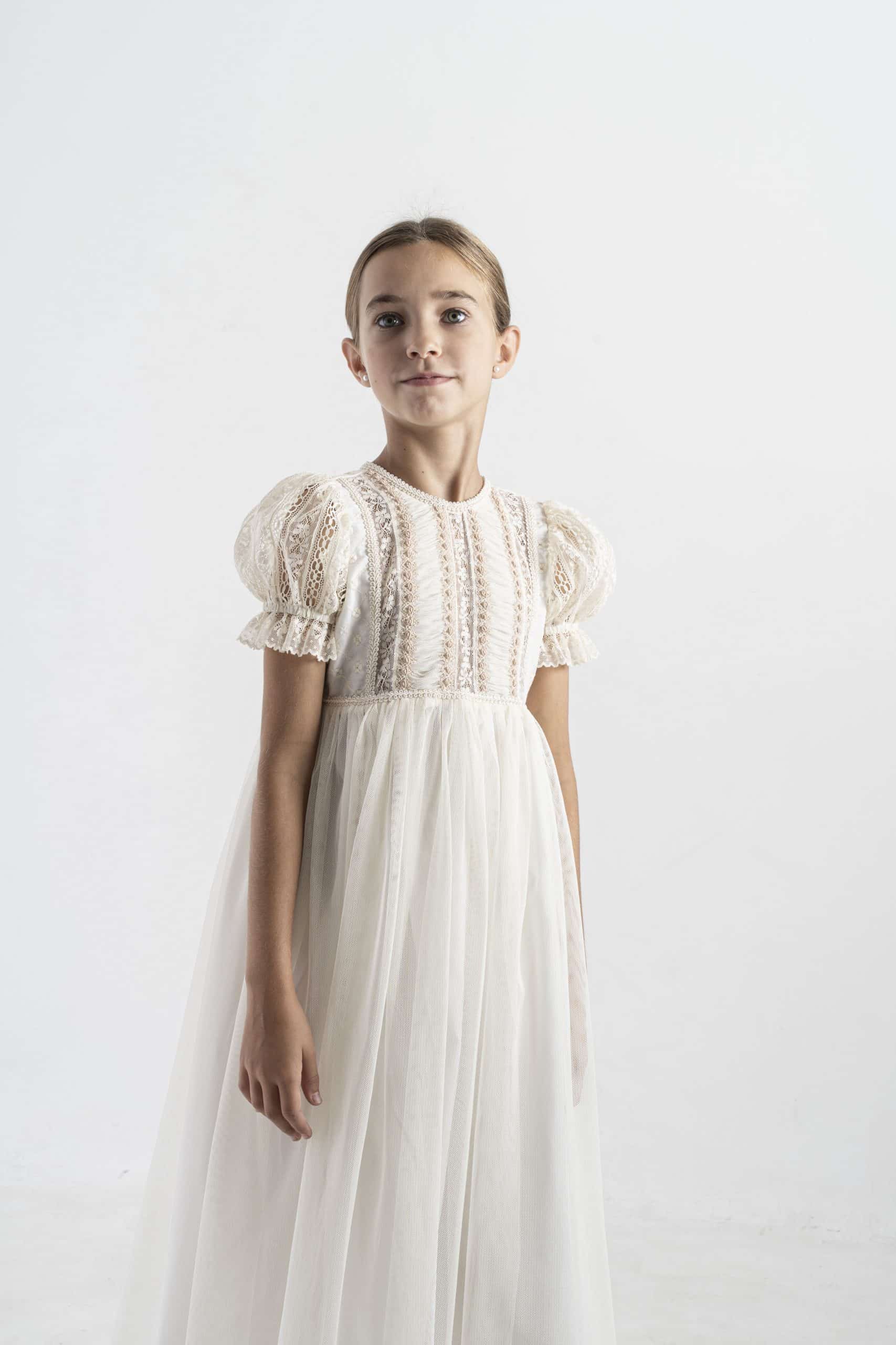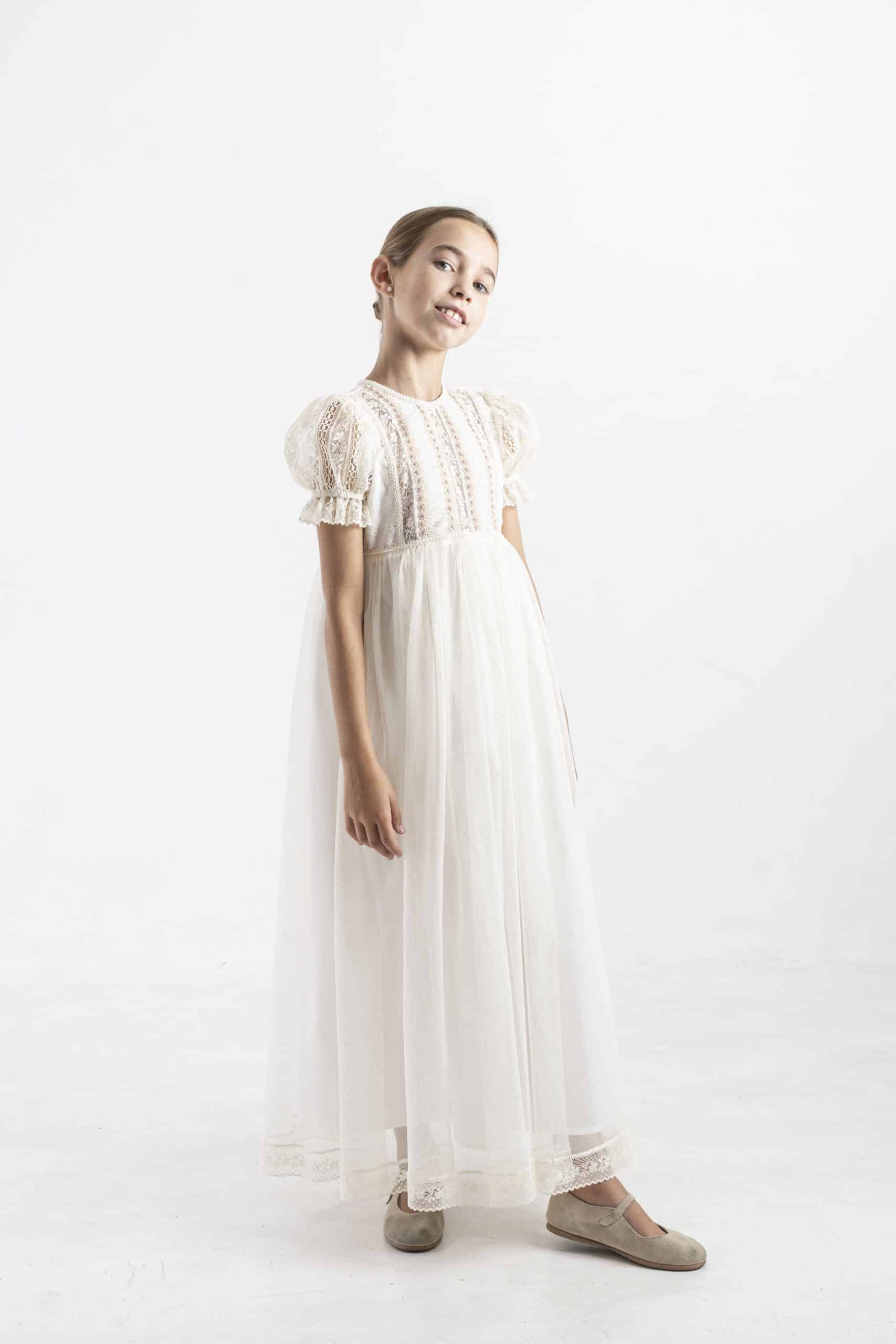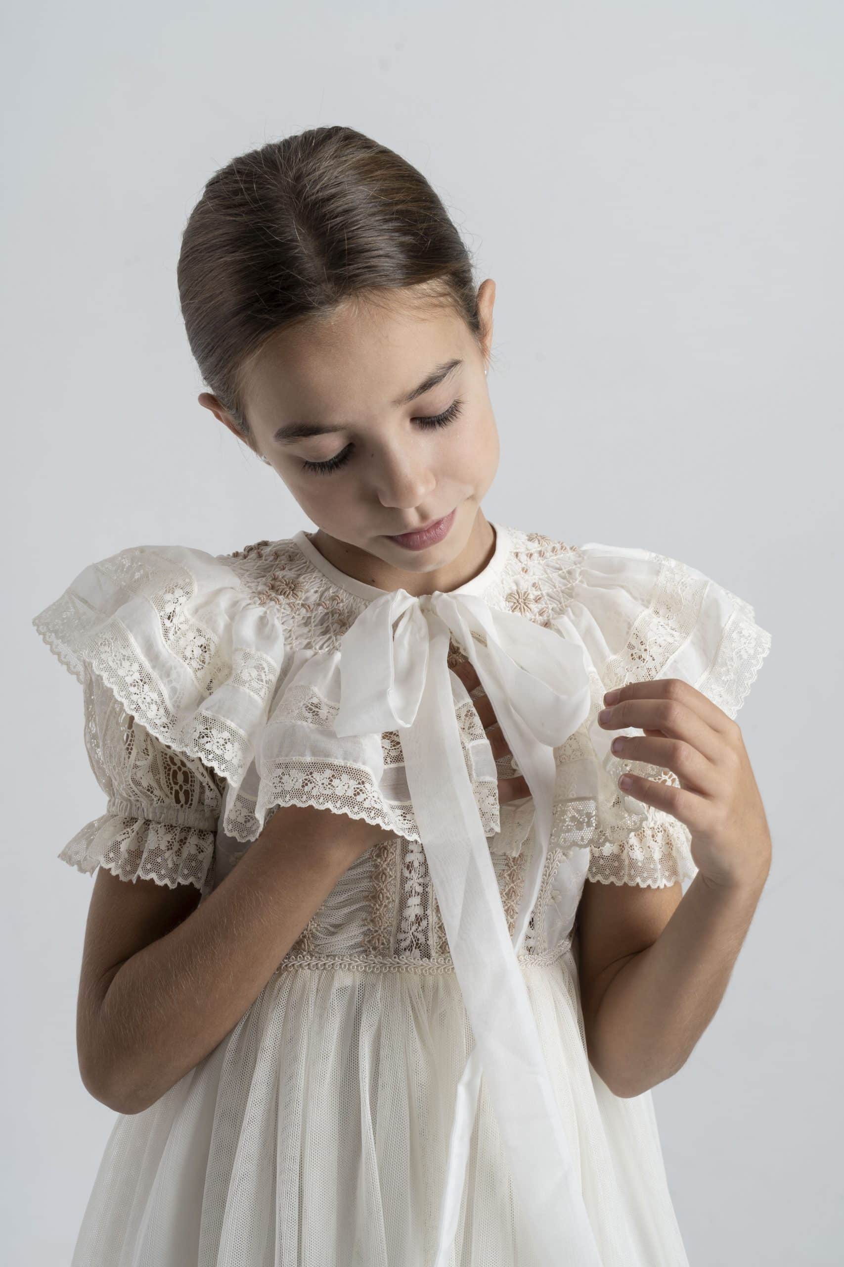 Vestido hecho en tul de algodón con bordado en nido de abeja hecho a mano. El vestido tiene delicados encajes de Valencienne francés. El plazo de entrega son 6 semanas. El vestido se hace a medida de modo que en los comentarios nos tenéis que especificar la fecha del evento, la talla de la niña, la edad, la altura, y las medidas, y si queda mucho para el evento os llamaremos para confirmar todos estos datos cuando se acerque el día  del evento y vayamos a empezar a confeccionar. Aquellas que lo deseéis, podéis venir a ver los vestidos en vivo pidiendo cita y a que tomemos medida a la niña. En la última foto se explica como tomar las medidas.