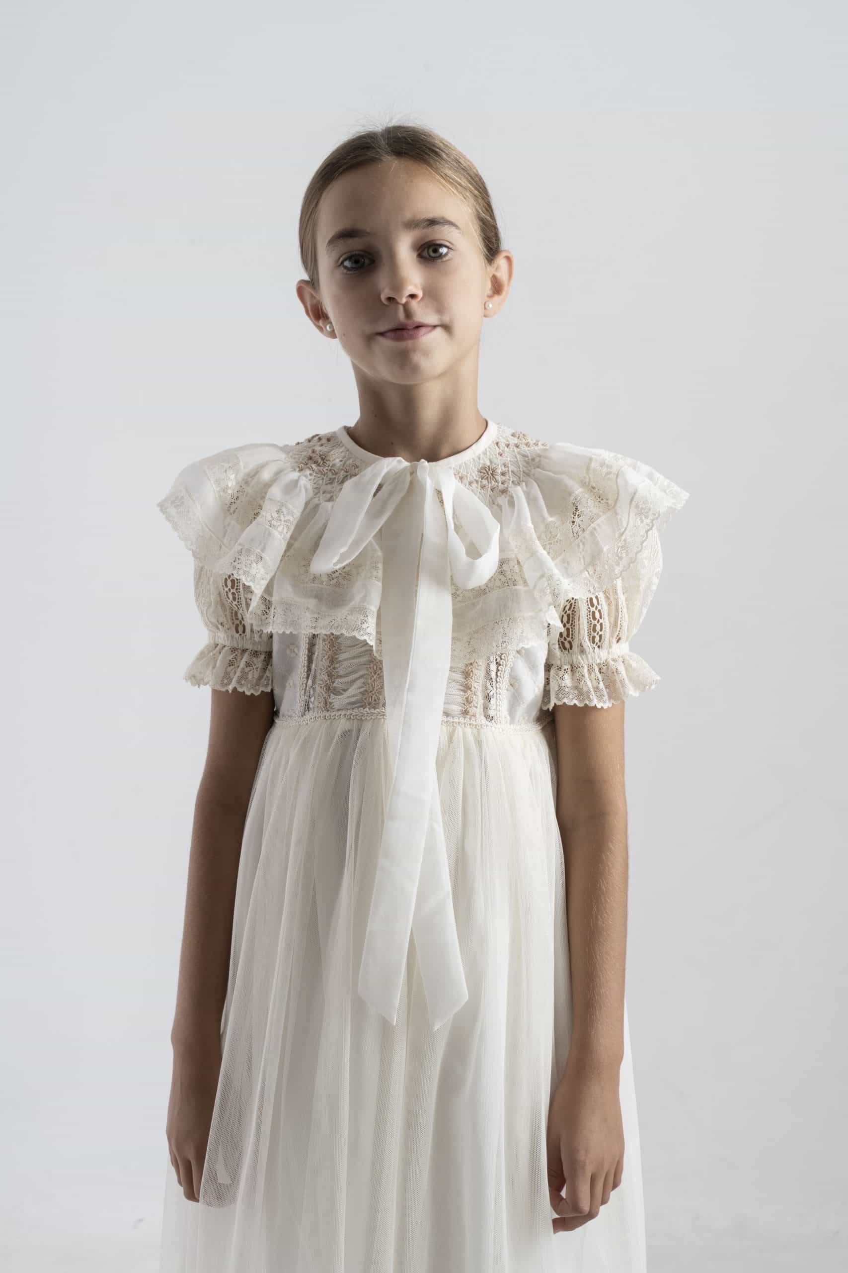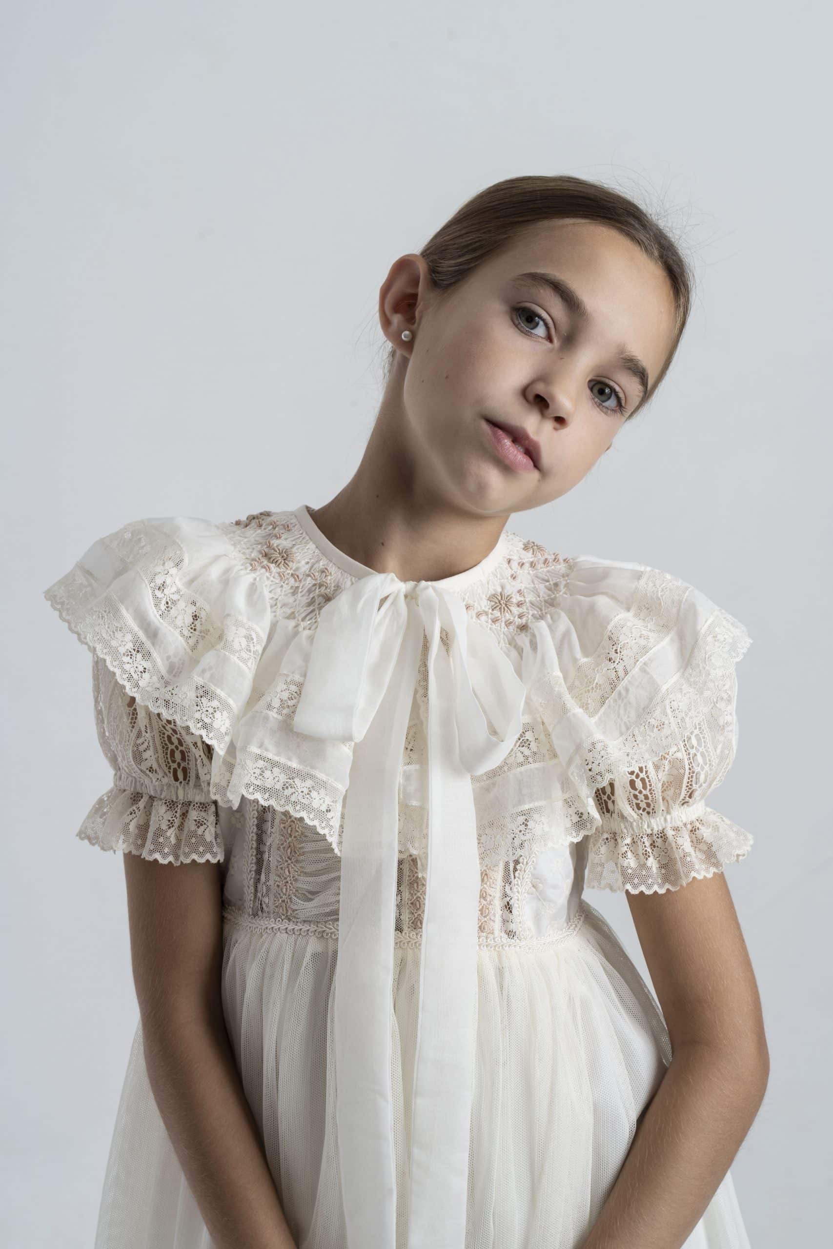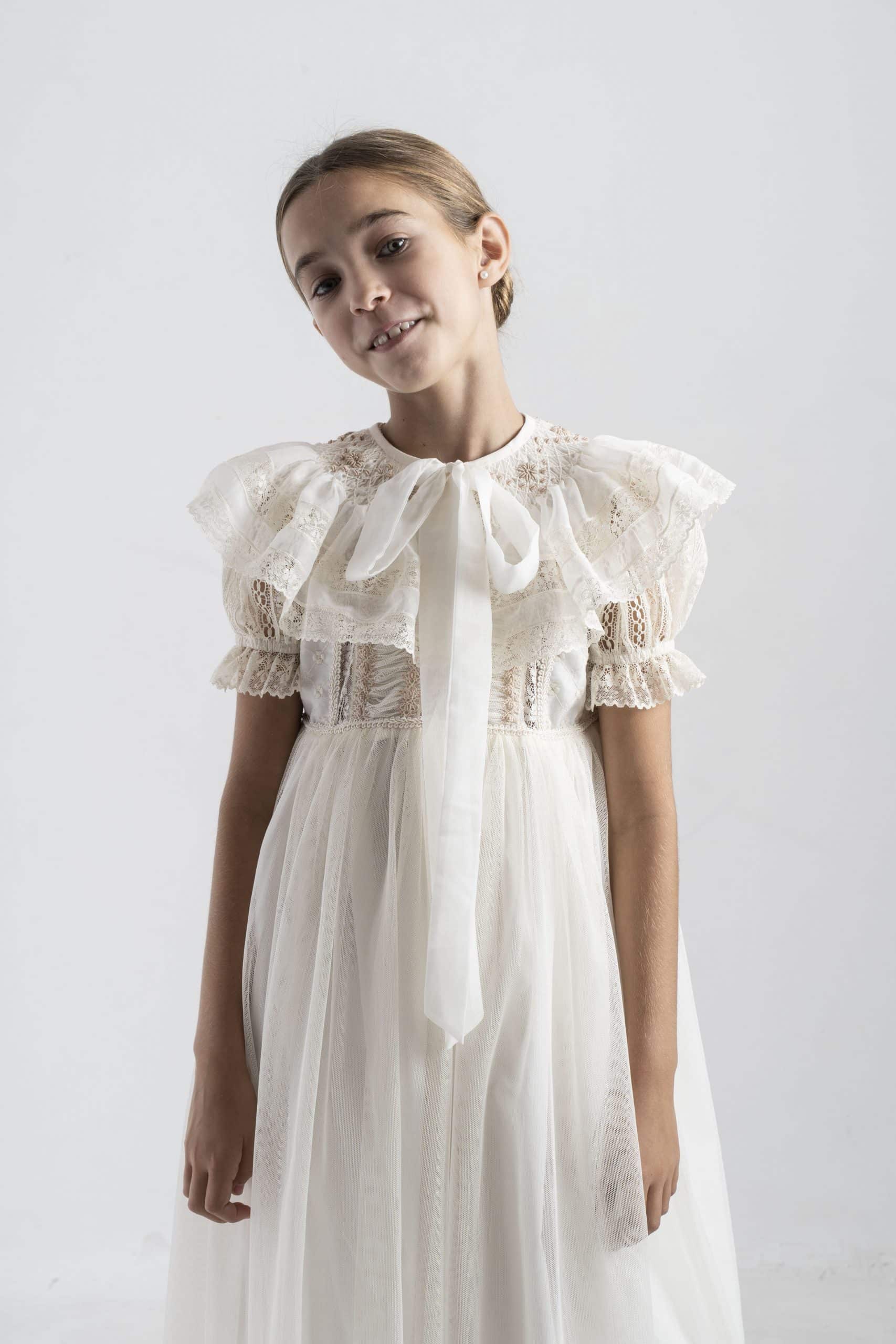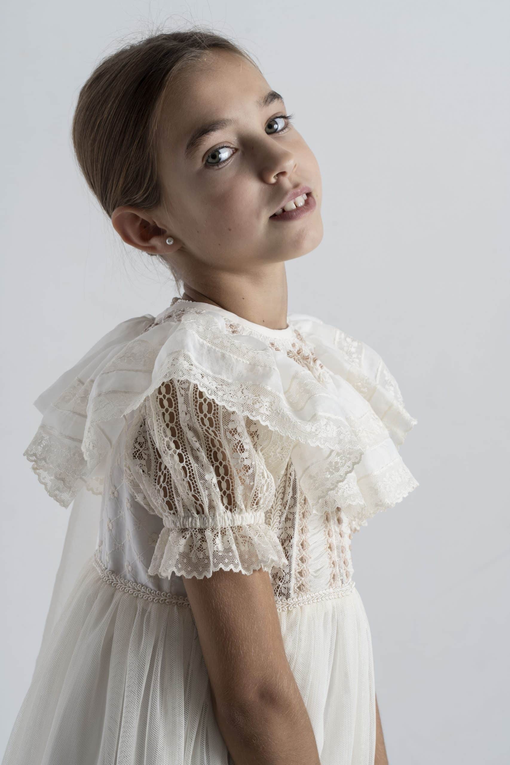 Vestido hecho en tul de algodón con bordado en nido de abeja hecho a mano. El vestido tiene delicados encajes de Valencienne francés. El plazo de entrega son 6 semanas. El vestido se hace a medida de modo que en los comentarios nos tenéis que especificar la fecha del evento, la talla de la niña, la edad, la altura, y las medidas, y si queda mucho para el evento os llamaremos para confirmar todos estos datos cuando se acerque el día  del evento y vayamos a empezar a confeccionar. Aquellas que lo deseéis, podéis venir a ver los vestidos en vivo pidiendo cita y a que tomemos medida a la niña. En la última foto se explica como tomar las medidas.